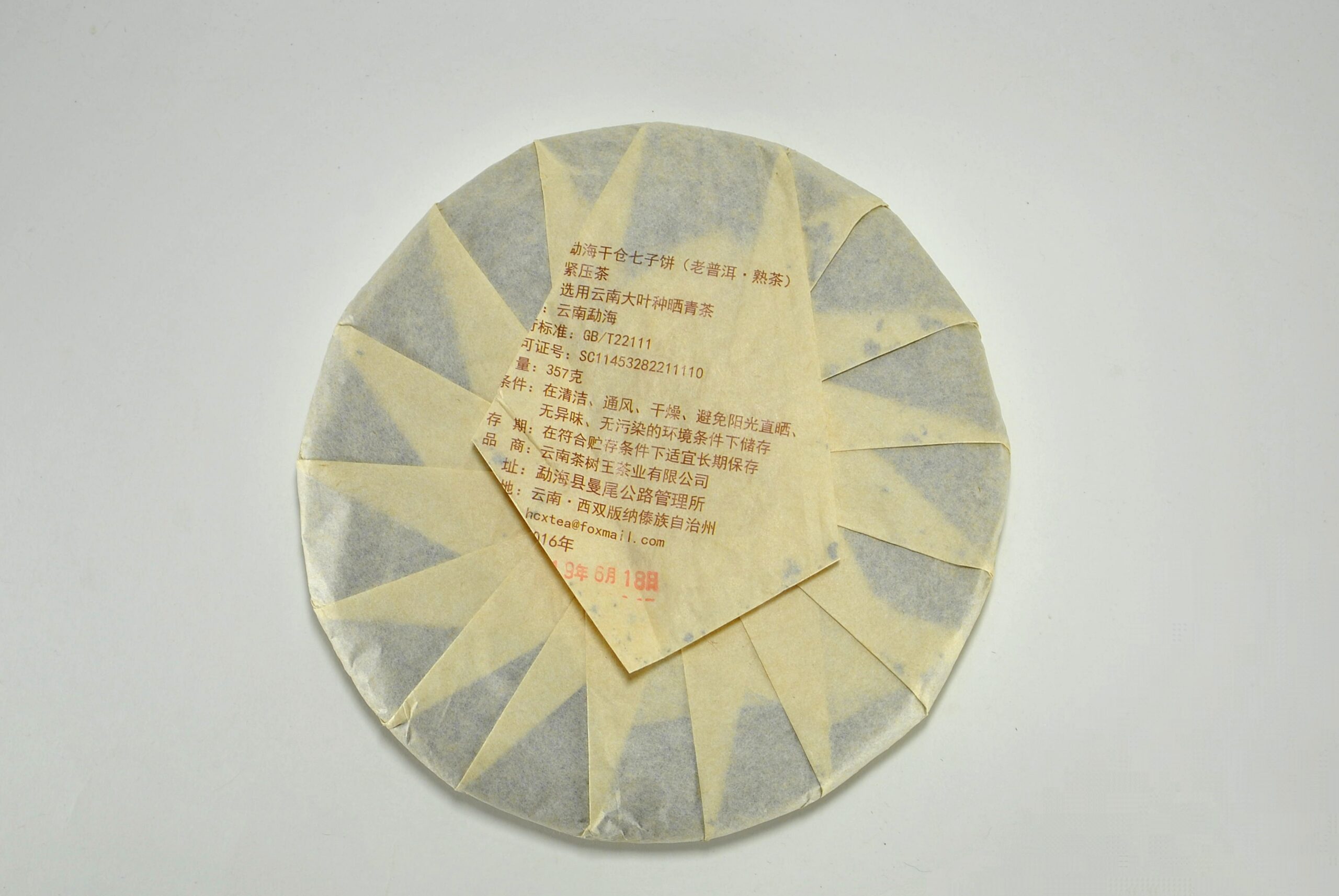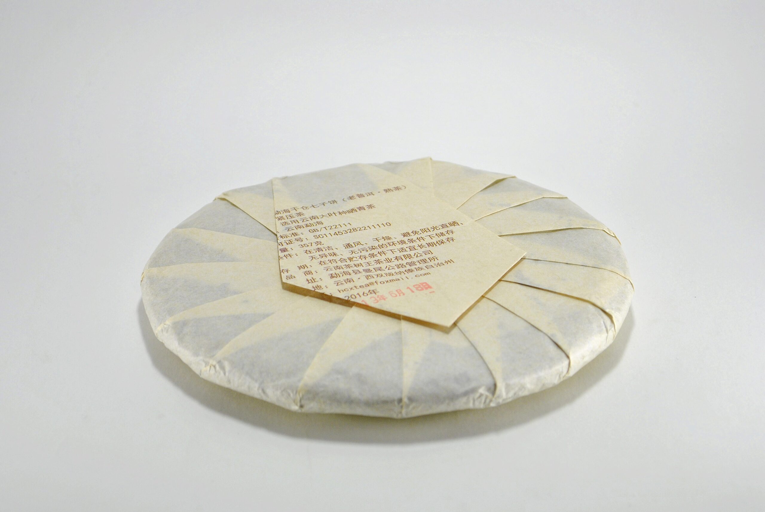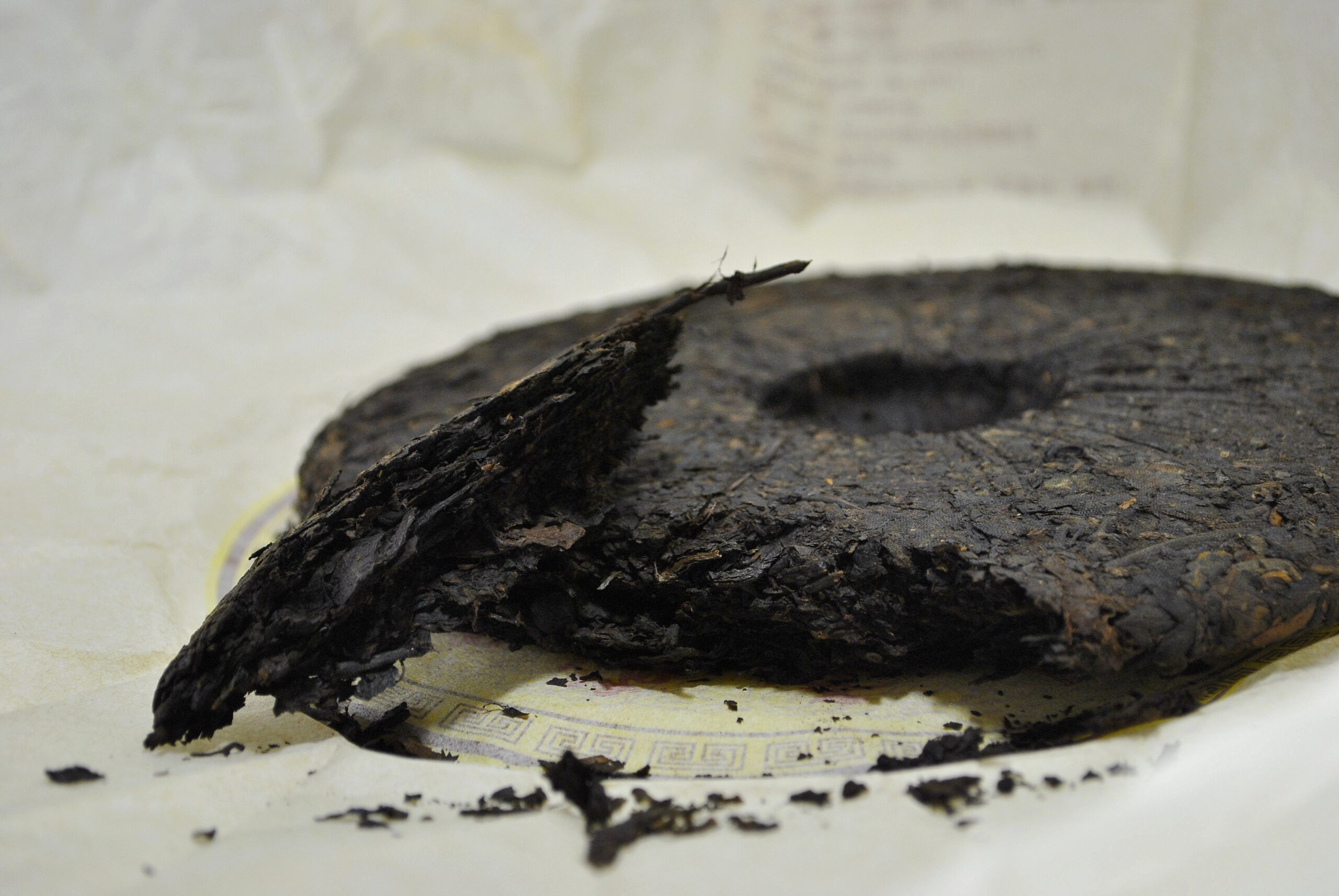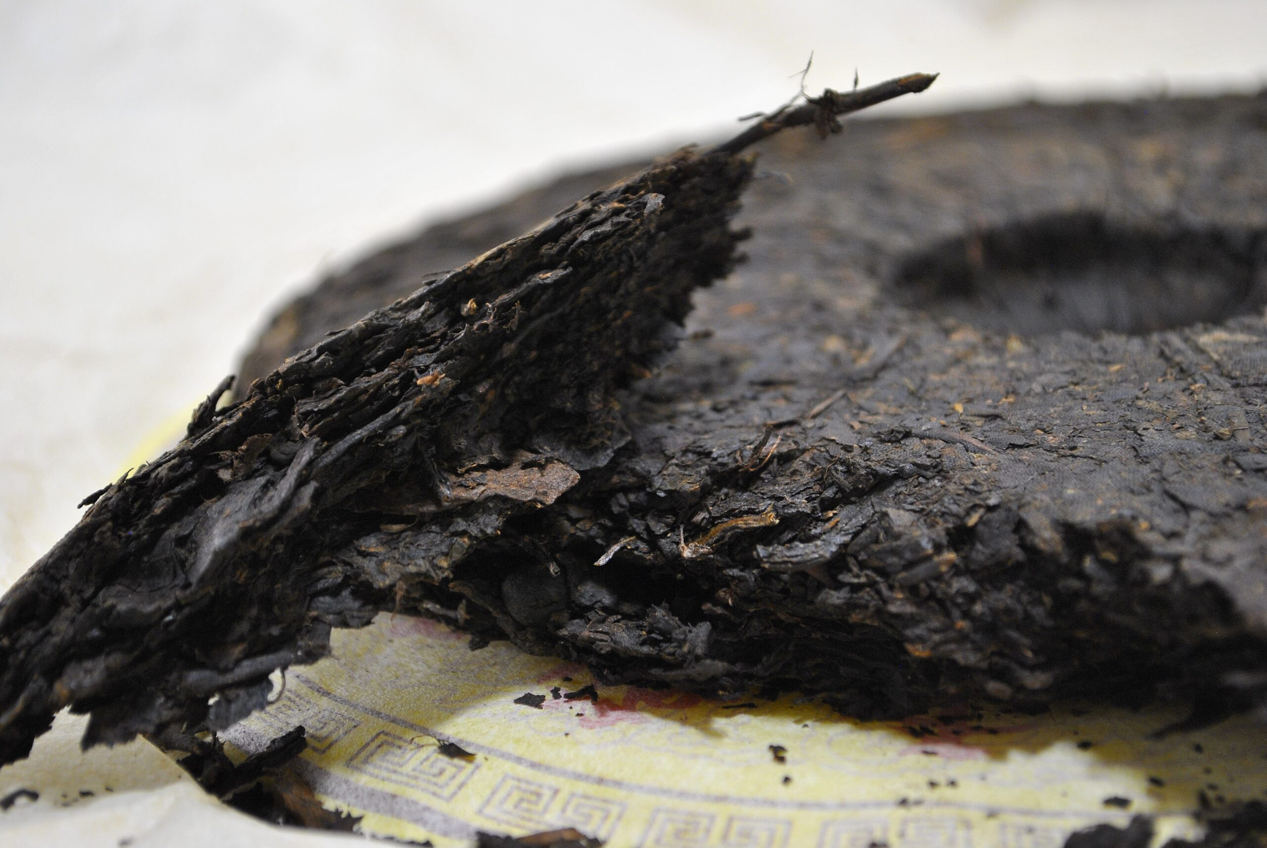 Аккуратные, плотные лепешки темного, почти шоколадного цвета с благородным бордовым отливом. Листья хорошо спрессованы, видны золотистые типсы и серебристые почки. Аромат сухого чая — насыщенный, глубокий, с доминирующими нотами черного шоколада, спеченой вишни, орехов и сухой земли.