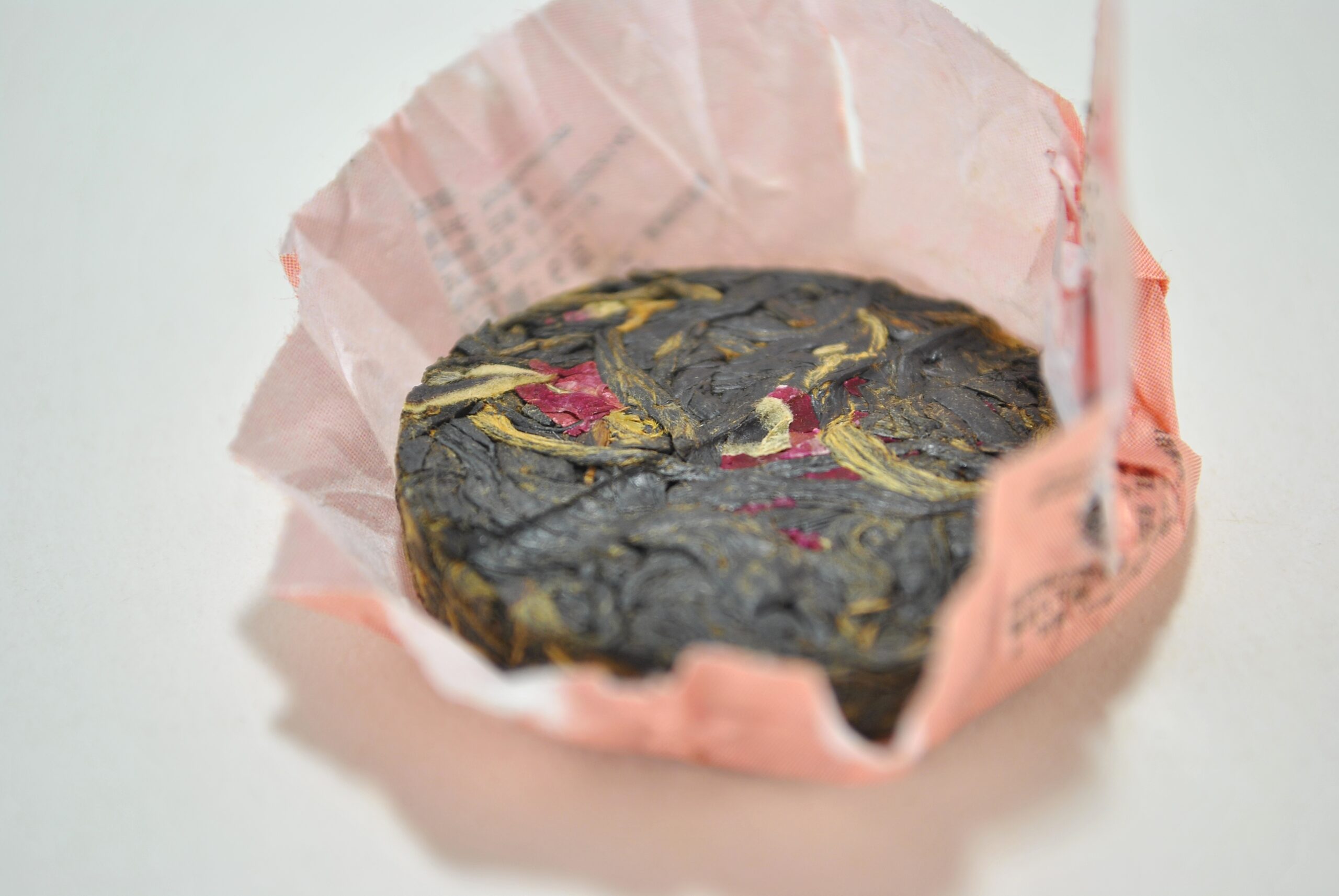 Изысканный купаж отборного шу пуэра из региона Мэнхай и лепестков розы сорта «Красный Мэйгуй», собранных в предгорьях Юньнани. Ферментированный чайный лист бережно смешан с цельными ароматными лепестками и спрессован в удобные таблетки. Выдержка 3 года.