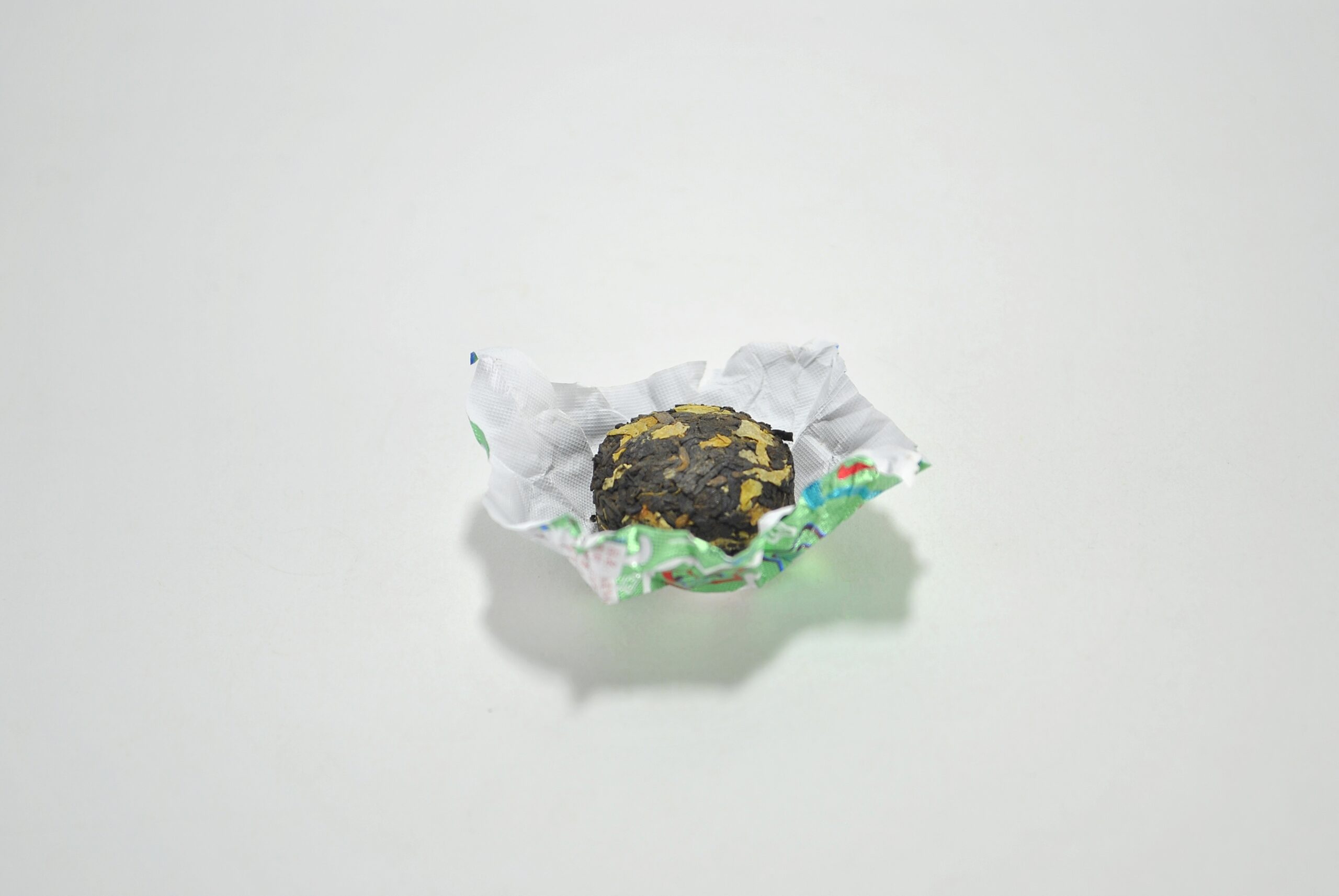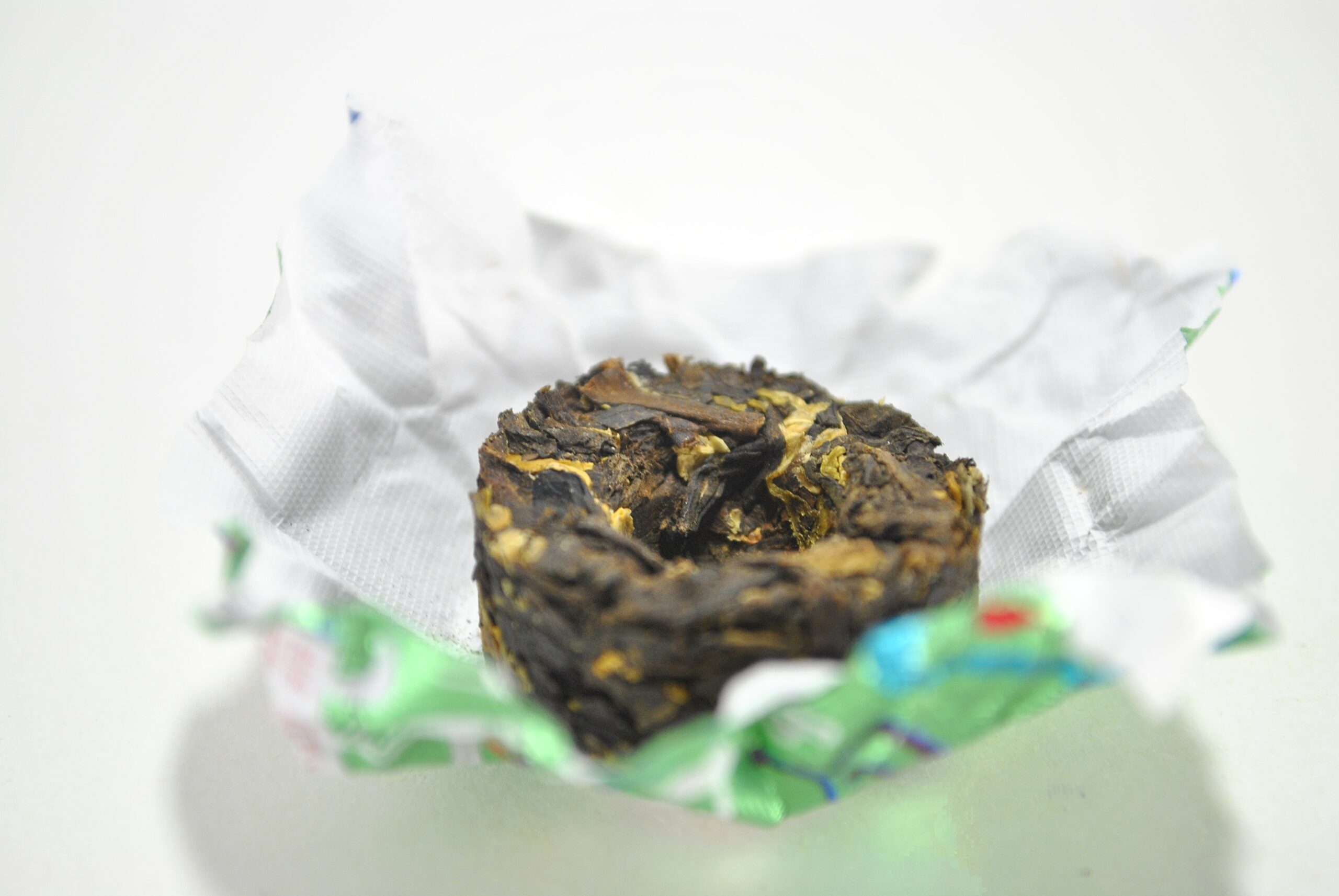 Идеально спрессованные таблетки весом 6 г с вкраплениями светло-золотистых жасминовых бутонов на фоне темно-коричневых чайных листьев. Аромат сухого чая — пьянящий, с переплетением бархатных нот черного шоколада, лесного ореха и свежего, охлаждающего благоухания жасмина.